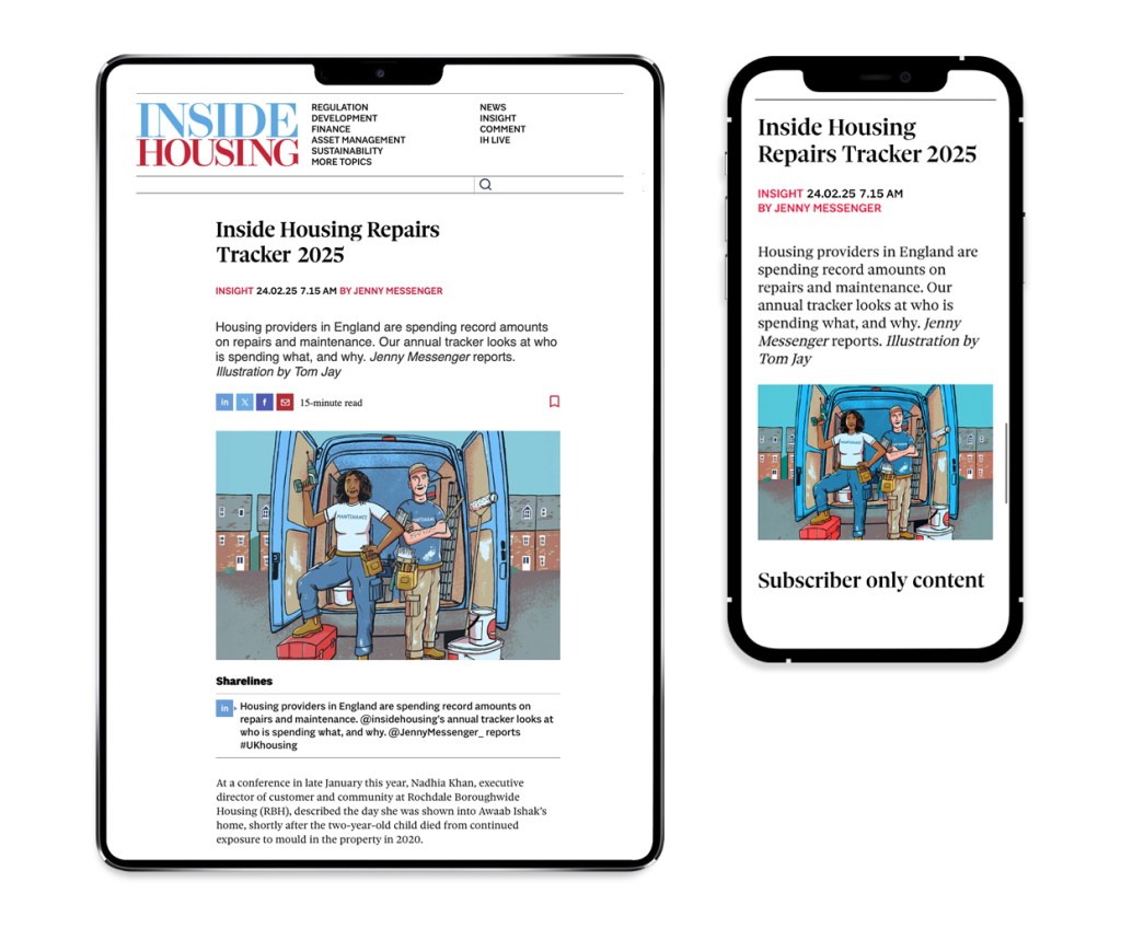 A series of commissioned illustrations for Inside Housing Magazine, a monthly trade publication that covers the United Kingdom’s social housing sector. The illustrations were published in both the print and digital editions of the magazine. Illustrations by Tom Jay, and Eva Bee.