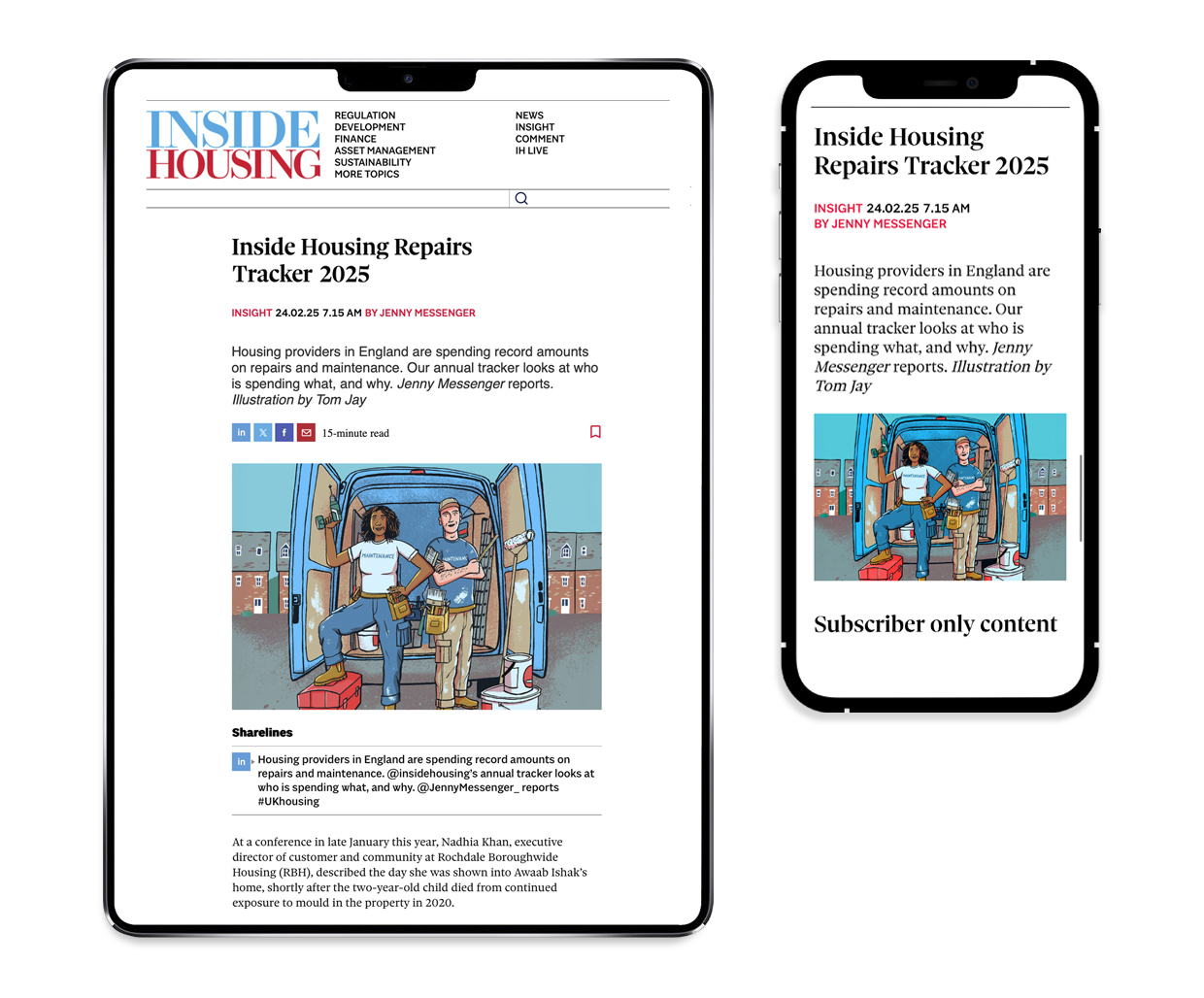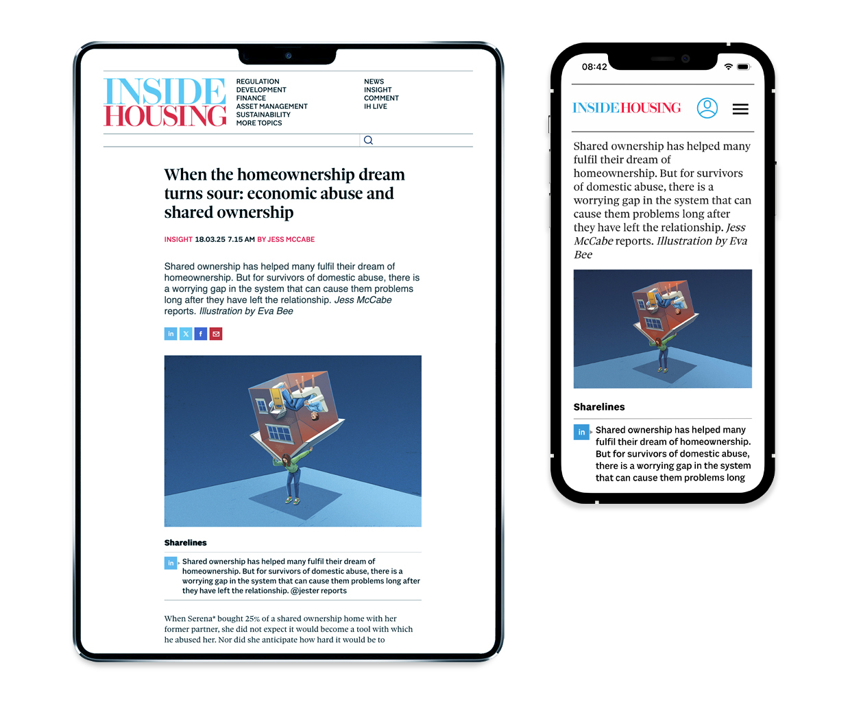 A series of commissioned illustrations for Inside Housing Magazine, a monthly trade publication that covers the United Kingdom’s social housing sector. The illustrations were published in both the print and digital editions of the magazine. Illustrations by Tom Jay, and Eva Bee.