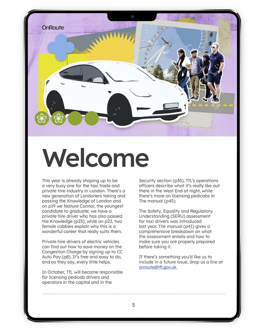 TFL 3 The Spring edition of On Route, a digital only magazine produced for Transport For London with content aimed at Taxi and Private Hire vehicles. Design, art direction, picture research and illustrations by Clive Johnston. Photography TfL.