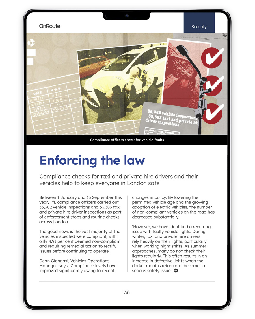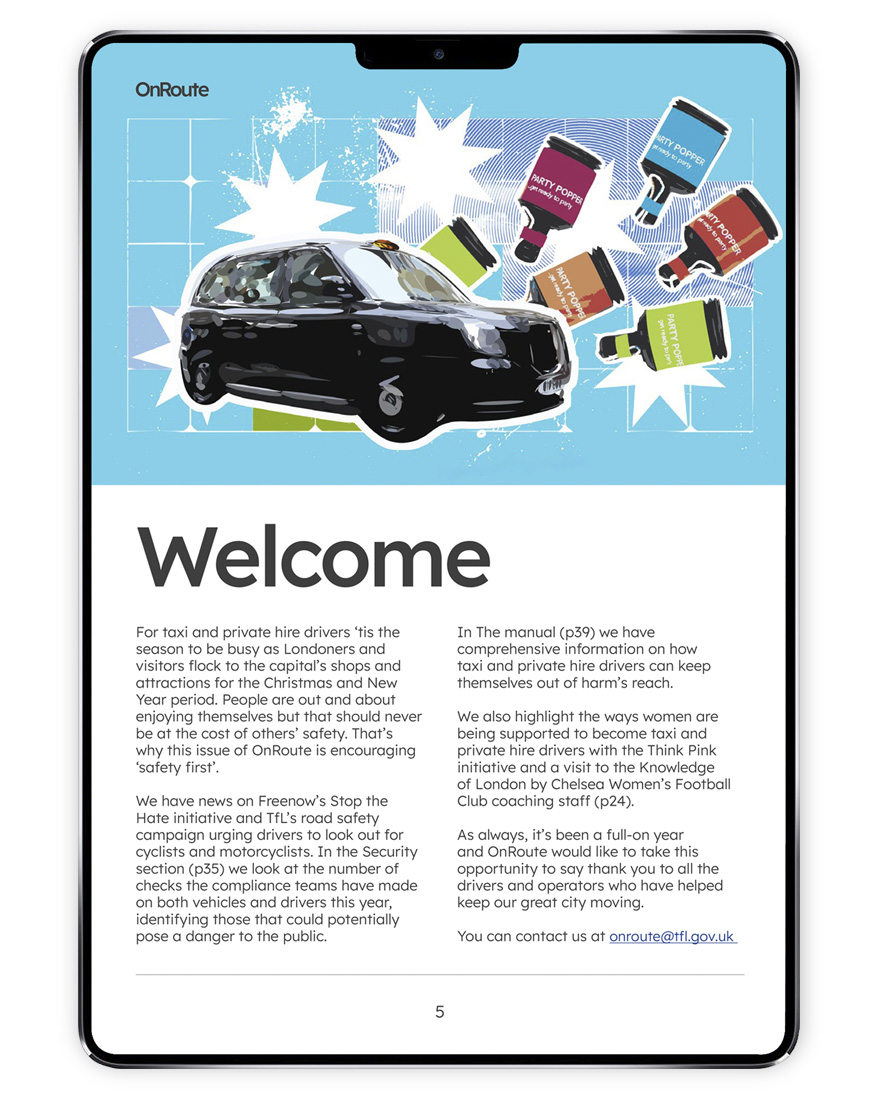 TFL 2 On Route is a digital only magazine produced for Transport For London with content aimed at Taxi and Private Hire vehicles. Design, art direction, picture research and cover illustrations by Clive Johnston. Photography TfL.